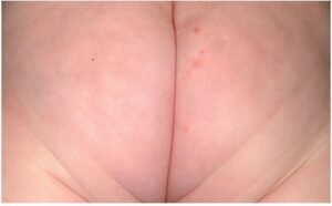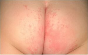 It’s characterized by more pronounced symptoms. The affected area may exhibit faint to definite pinkness in a larger area, along with definite redness in a small area. The baby may experience intense redness in a tiny area, accompanied by scattered raised bumps (papules) and moderate dryness or scaling. In some cases, there may be slight peeling and swelling (edema).